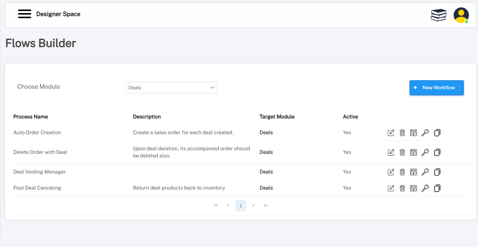 To start creating a new Flow, click on the “New Workflow” button on the top right side of the page.