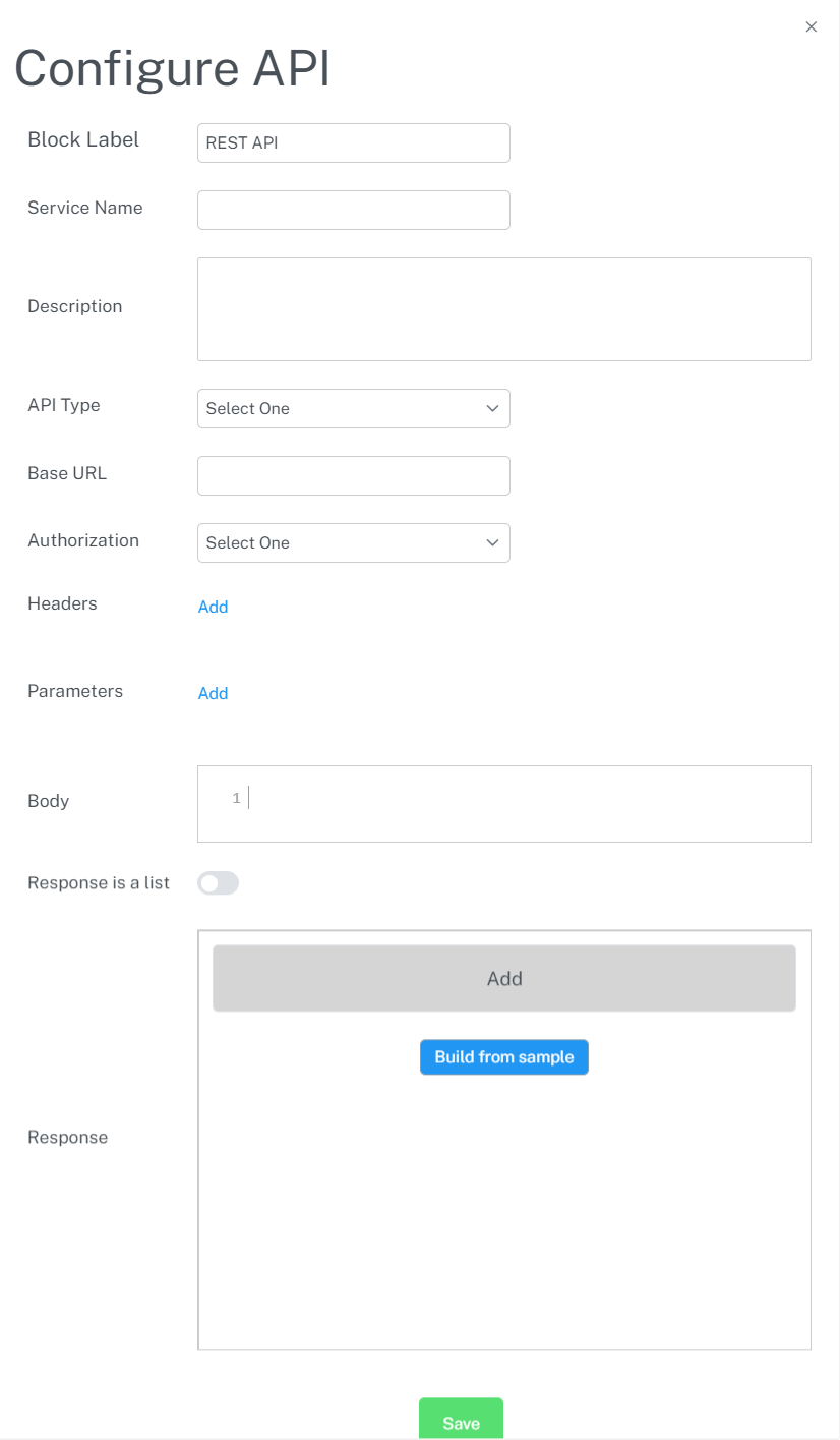 Integrate Beezr with external systems using restful APIs. Drag a "REST API" step into the workspace and click the gear icon to open the configuration.