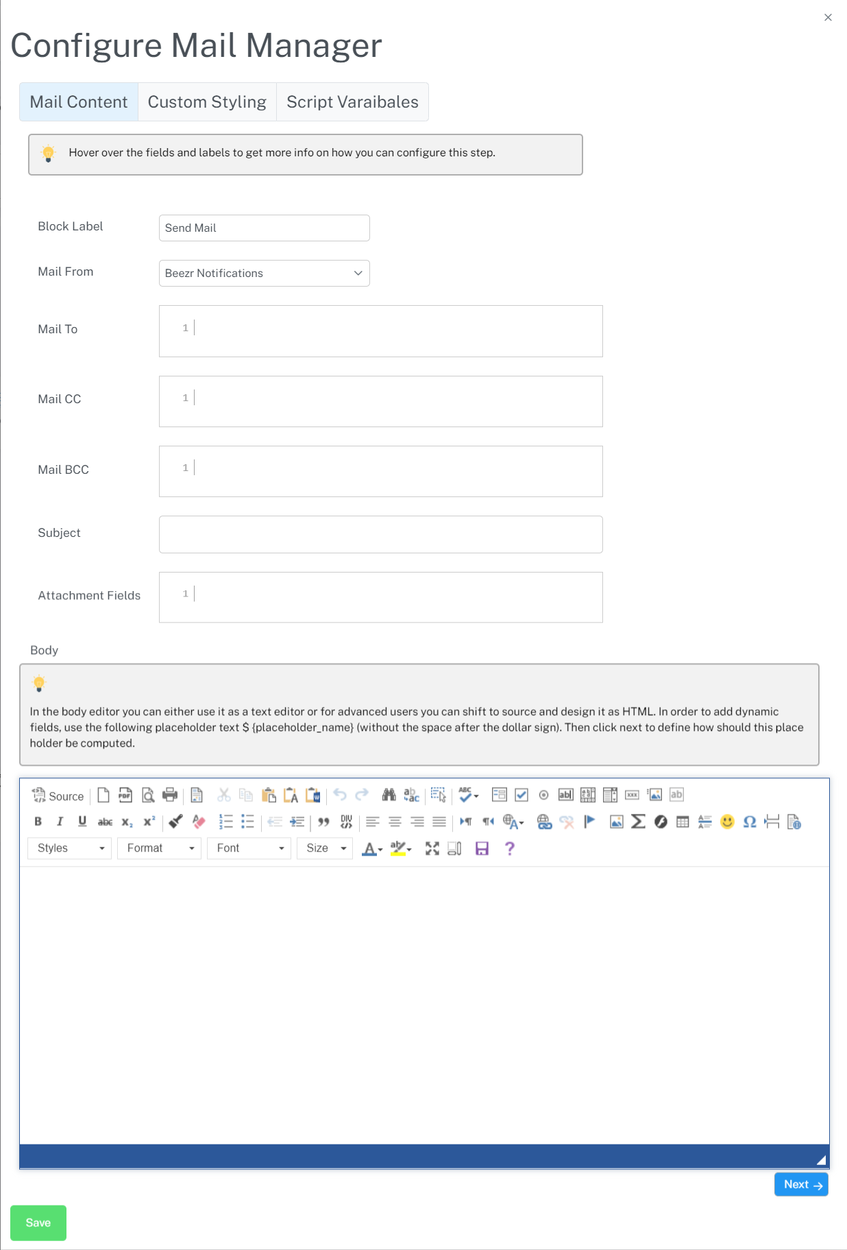 | Mail From | Dropdown | If you configured your company emails in Beezr; you can choose which email this mail should be from. For example; you could have support@abc.com or sales@abc.com/ so based on the business you can choose which email is best used. |