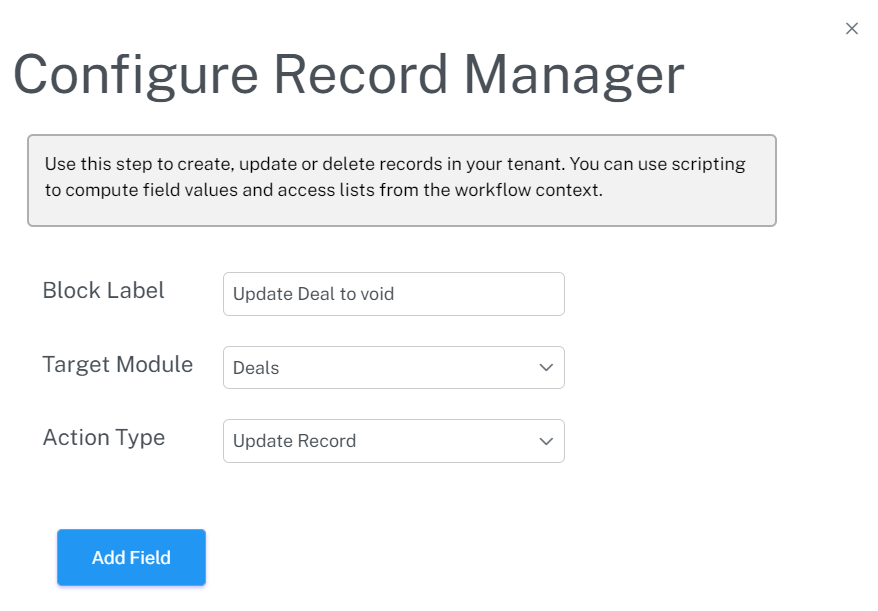 - When using the record manager to update the record in the target module of the Flow itself, all you need to do is add the fields you want to update the values of.