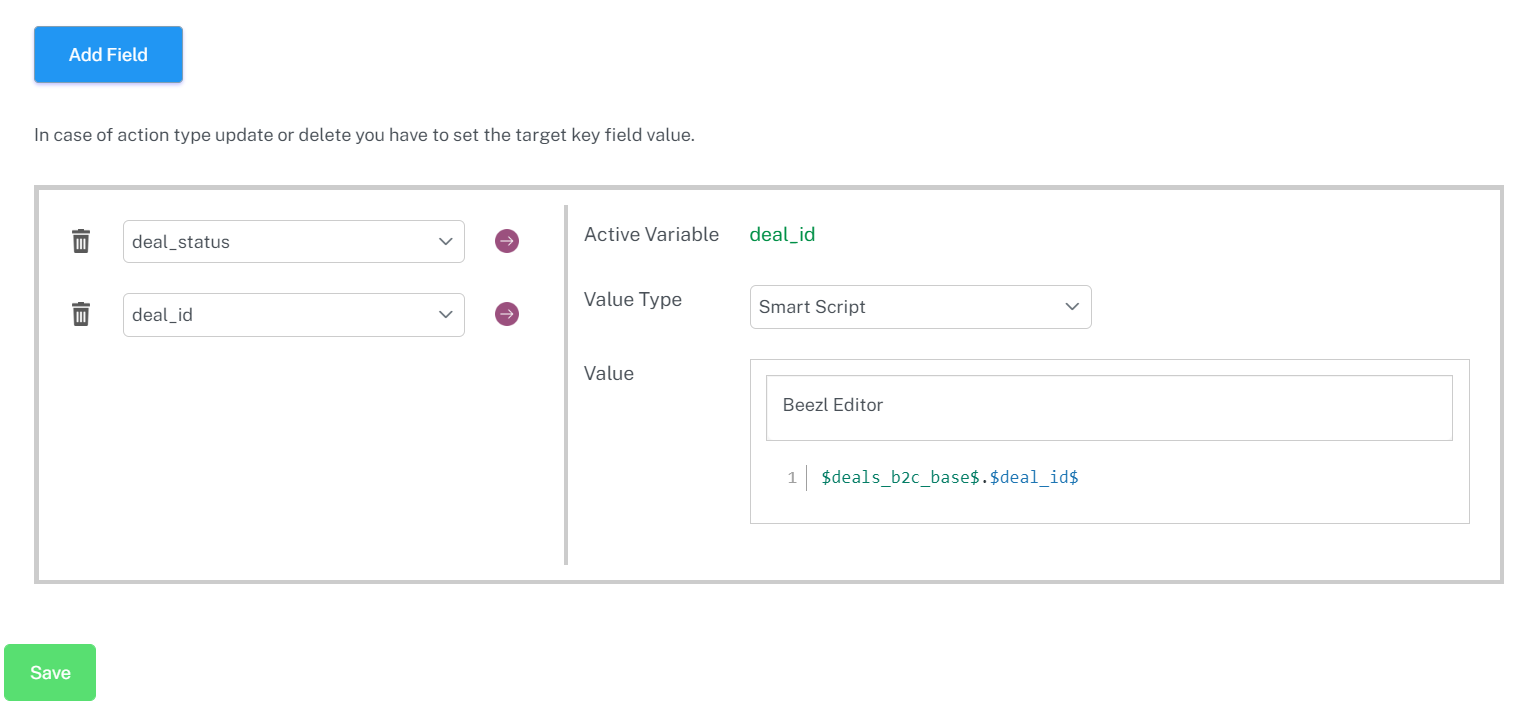 | Value Type | Dropdown | When setting the value of a field, you have one of two ways you can do that; either choose “Default”, which gives you a field type similar to the original type, for example, a lookup field will be a dropdown with the lookup values. The other way is through Beezl Smart Script. |