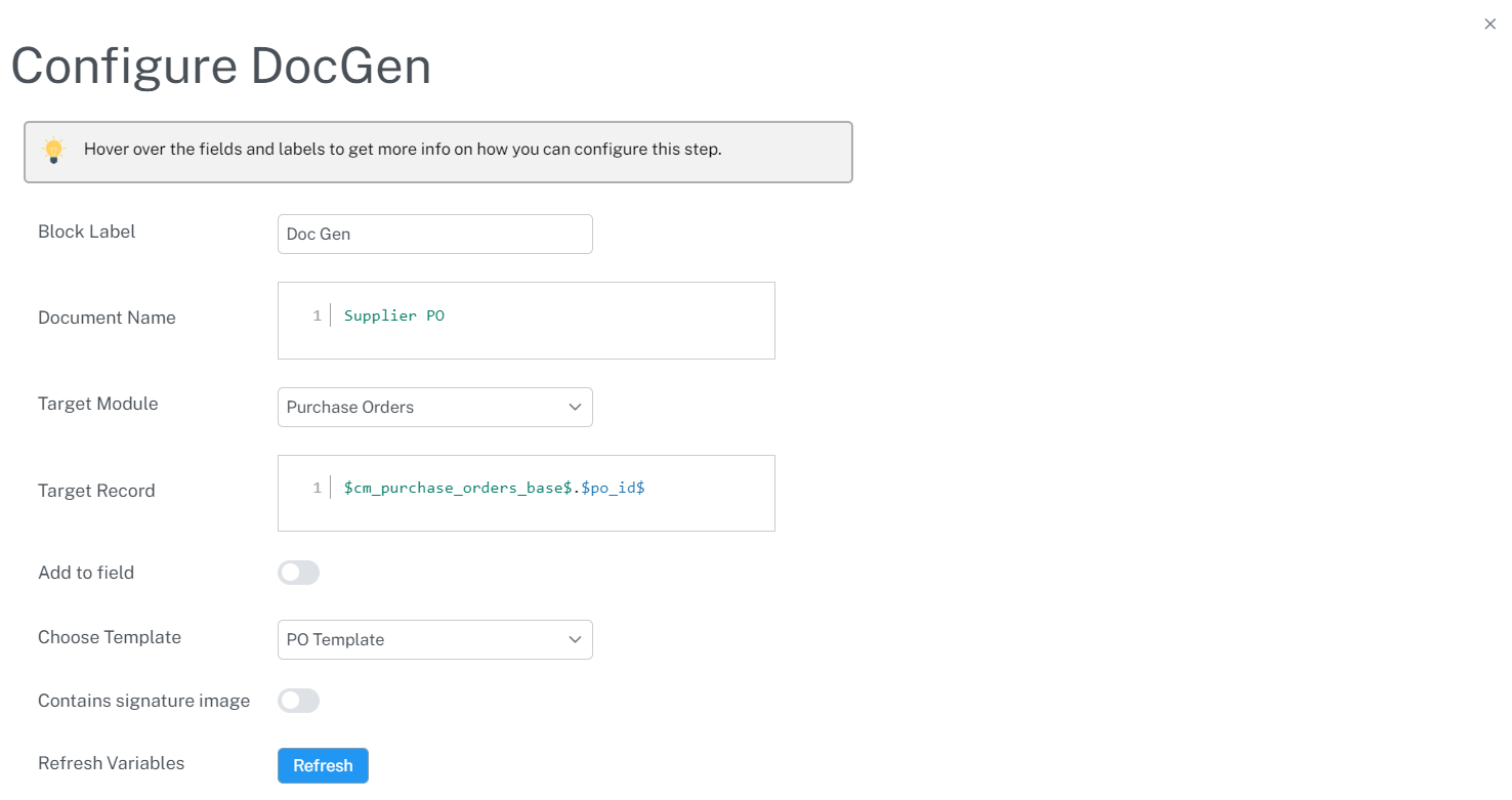 Drop a "Doc Gen" step into the workspace and click the settings icon to open the configuration.
